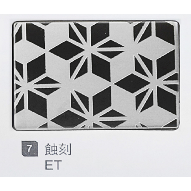 蝕刻不銹鋼板 本公司生產之蝕刻鋼板,除採用一般網版印刷製程之外,更引進國外先進技術支感光印刷製程。 此製程除可以提升印刷精密度之外,更可已多次重複蝕刻增加其層次感。 蝕刻製程並引進最先進之雙向蝕刻機,蝕刻深度可達0.5mm高出一般高級蝕刻0.03mm甚多。 本公司另有一系列樣式供客戶選擇,亦可提供客製化設計服務。
